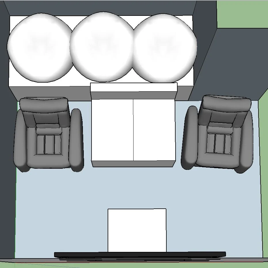 Blue LED lights were added behind the screen and under the rear futon to create indirect theater lighting and create a cool, soft ambiance, thoughtfully individually controlled for viewer preference.